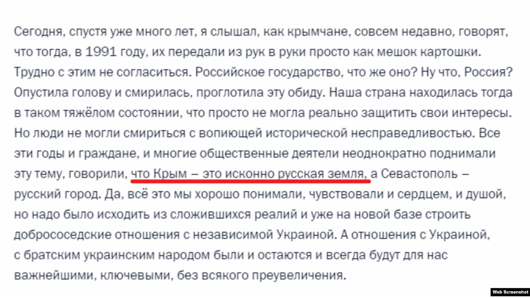 Володимир Путін заявив: «Всі ці роки і громадяни, і багато громадських діячів неодноразово порушували цю тему, говорили, що Крим – це споконвічна російська земля, а Севастополь – російське місто. Так, все це ми добре розуміли, відчували і серцем, і душею, але треба було виходити з реалій, які склалися і вже на новій базі будувати добросусідські відносини з незалежною Україною».