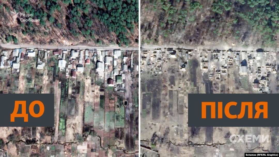 Журналісти проєкту Радіо Свобода «Схеми» обрали декілька знімків із космосу, щоб побачити різницю між тим, як виглядали міста чи селища до 24 лютого 2022 року та після. Одні населені пункти зруйновані частково, інші – майже повністю стерті з лиця землі.