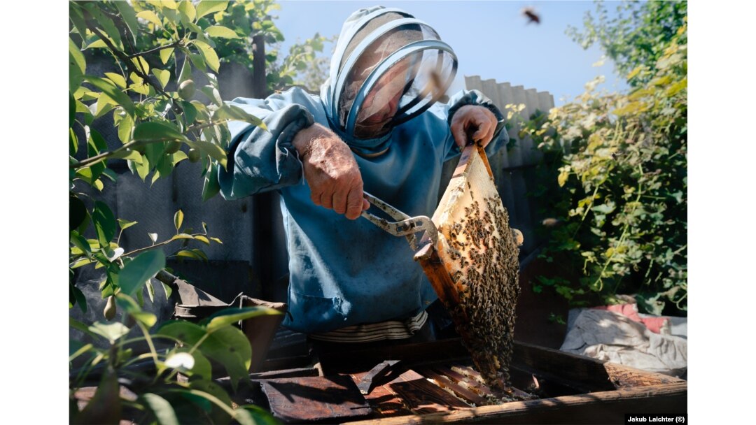 Звук дронів змішується з дзижчанням бджіл, але ні дрони, ні українська артилерія, яка вистрілює постріл за пострілом з сусіднього саду, не турбують Леоніда. Він повністю зосереджений на своїй роботі. Одну за одною він витягує рамки з одного з 14 вуликів. Обережно струшує бджіл зі стільників і розглядає їх.