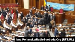 Близько 20 народних депутатів заблокували трибуну Верховної Ради. Про свої вимоги вони не повідомляють.