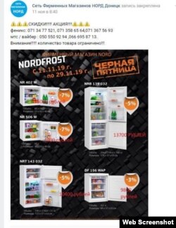 Много рекламы о «Black Friday» есть в донецких соцсетях. К примеру, на маленькие холодильники бывшего завода Nord (сейчас здесь он называется «Донфрост») скидка – 7%, и стоят они 5000 рублей (примерно 2000 грн). Действуют и сниженные цены на мебель – до 50%. Реклама обещает, что скидки продлятся и на выходных.