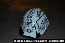 Леніна скидав (іграшкового – ред.), на Майдані був, тепер має звичку щоночі співати Гімн. Якось він опинився на справжній касці, яку ми розписували в КМДА, коли там жили люди під час обстрілів. Я намалювала там Інжира і слоган –«А якщо прийдуть тітушки, зробим з них одну пампушку».