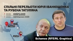 Аналізуючи поїздки Іванющенка до РФ, «Схеми» звернули увагу на один із чартерних рейсів. Зокрема, 15 вересня 2021 з Туреччини в Росію з ним і Татуляном літали два бізнесмени родом із нині окупованого Росією Єнакієва на Донеччині – Анатолій Зуєв й Ілля Подтинний. Крім того, Іванющенко здійснював перельоти і з кожним із бізнесменів окремо.