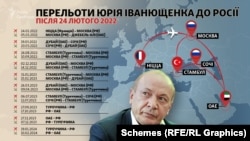 «Схеми» порахували, що з початку вторгнення Іванющенко був у Росії щонайменше десять разів: із них чотири – у 2022-му, п’ять – у 2023-му й один раз – у 2024 році. Не виключено, що він продовжував літати до РФ і надалі.