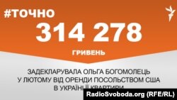 Народний депутат України, голова комітету Верховної Ради з питань охорони здоров’я, член фракції «Блок Петра Порошенка» Ольга Богомолець у лютому задекларувала дохід від надання в оренду нерухомості посольству США в Україні на загальну суму 314278 гривень. Така інформація міститься в Єдиному державному реєстрі декларацій осіб, уповноважених на виконання функцій держави або місцевого самоврядування, повідомляє #Точно, проект Радіо Свобода.