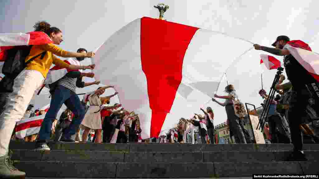 Близько сотні людей зібралися 4 жовтня на майдані Незалежності в Києві. З біло-червоно-білими прапорами вони пройшли від майдану центром міста до будівлі посольства Білорусі. Учасники акції скандували: «Живе Білорусь!», «Сашу в автозак» та інші гасла.
