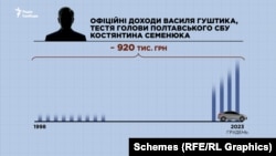 Що ж до офіційних легальних доходів самого очільника полтавського СБУ – його декларація закрита, але оклад держслужбовця на такій посаді зазвичай у перерахунку не перевищує 3 тисяч доларів на місяць, після оподаткування – ще менше. Дружина декларувала свій майновий стан, як посадовиця – це скромні надходження від Чернівецької податкової, соціальні виплати, та заощадження що сумарно не перевищують 30 тисяч доларів.