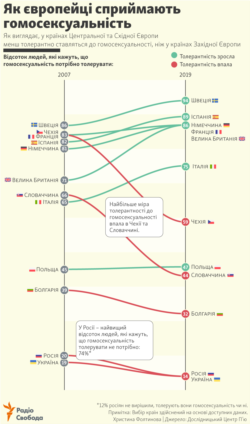 Як виглядає, у країнах Центральної та Східної Європи менш толерантно ставляться до гомосексуальності, ніж у країнах Західної Європи.