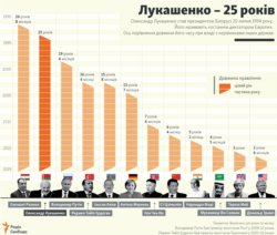 Олександр Лукашенко став президентом Білорусі 20 липня 1994 року. Його називають «останнім диктатором Європи». Ось порівняння довжини його часу при владі з керівниками інших держав.